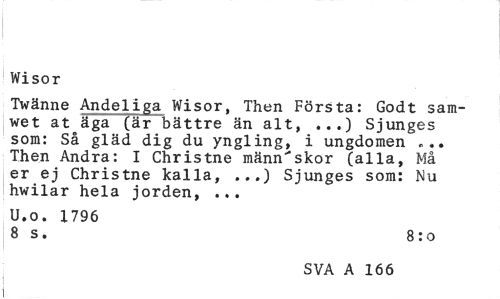 //// Wisor //// Twänne Andel ljja Wisor, Then Första: God t sam-wet at äga (är bättre än alt, ...) Sjunges som: Så gläd dig du yngling, i ungdomen ... Then Andra: I Christne människor (alla, Må er ej Christne kalla, ...) Sjunges som: Nu hwilar hela jorden, ... //// U.o. 1796 //// 8 s. 8:0 //// SVA A 162 81 ////