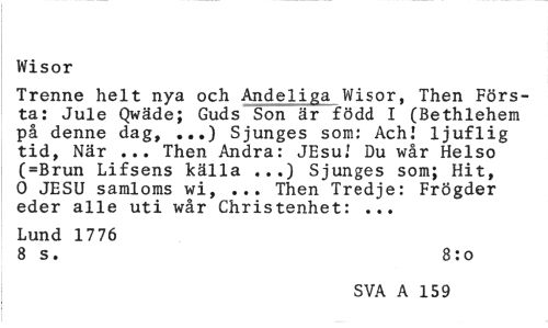 //// Wisor //// Trenne helt nya och Andeliga Wisor, Then Första: Jule Qwäde; Guds Son är född I (Bethlehem på denne dag, ...) Sjunges som: AchJ ljuflig tid, När ... Then Andra: JEsu/ Du wår Helso (=Brun Lifsens källa Sjunges som; Hit, //// 0 JESU samloms wi, ... Then Tredje: Frögder eder alle uti wår Christenhet: ... //// Lund 1776 //// 8 s. 8:o //// SVA A 825 ////