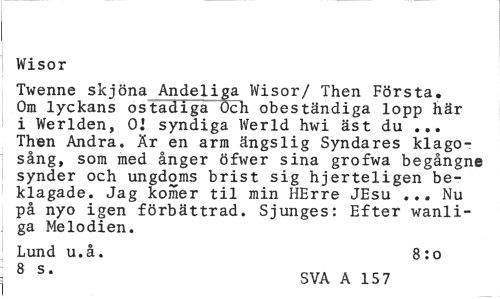 //// Wisor //// Twenne skjöna Andeliga Wisor/ Then Första. Om lyckans ostadiga Och obeständiga lopp här i Werlden, 0] syndiga Werld hwi äst du ... Then Andra, Är en arm ängslig Syndares klagosång, som med ånger öfwer sina grofwa begångne synder och ungdoms brist sig hjerteligen beklagade. Jag komer til min HErre JEsu ... Nu på nyo igen förbättrad. Sjunges: Efter wanli-ga Melodien. //// Lund u.å. 8:0 //// 8 S> SVA A 15 7 ////
