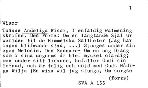 //// 1 //// Wisor //// Twänne Andeliga Wisor, I enfaldig wälmening skrifne. Den Förra: Om en längtande Själ ur werlden til de Himmelska Sällheter (Jag har ingen blifwande stad, ...) Sjunges under sin egen Melodie. Den Sednare- Om en ung Dräng som i sina ungdoms år blef mycket ofärdig; men under sitt lidande, befaller Gudi sin lefnad, och är tolig och nöjd med Guds Nådiga Wilja (En wisa wil jag sjunga, Om sorgse //// (forts) //// SVA A 155 ////