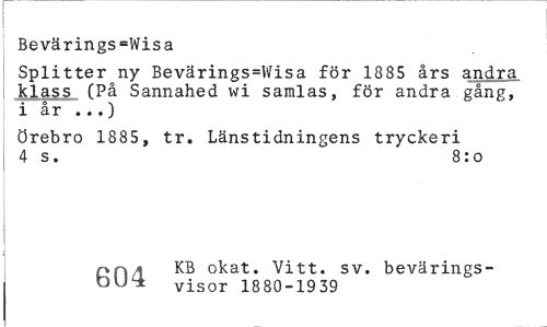 //// Bevärings=Wisa //// Splitter ny Bevärings=Wisa för 1885 års andra klass (På Sannahed wi samlas, för andra gång, i år ..,) //// Örebro 1885, tr. Länstidningens tryckeri 4 s. 8:o //// on/l ^B okat. Vitt. sv. bevärings- //// visor 1880-1939 ////