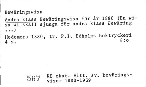 //// Bewäringswisa //// Andra klass Bewäringswisa för år 1880 (En wi-s"a wi skall sjunga för andra klass Bewäring //// Hedemora 1880, tr. P.I. Edholms boktryckeri 4 s. 8:o //// crr>^ KB okat. Vitt. sv. bevärings- //// 00 ' visor 1880-1939 ////