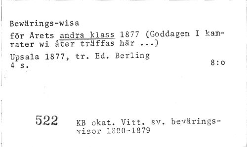 //// i Bewärings-wisa //// för Årets andra klass 18 77 (Goddagen I kamrater wi åter träffas här ...) //// Upsala 1877, tr. Ed. Berling 4 s. 8:o //// c-r\f> KB okat. Vitt. sv. bevärings- //// visor 1800-1879 ////