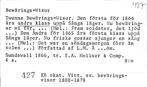 //// Tff //// Bewärings=Wisor //// Twenne Bewäringswisor. Den första för 1866 års andra klass uppå Sånga läger. Nu bewäringår wi får, ... (Mel.: Fram soldater, det ljöd ...) Den Andra för 1865 års första klass uppå Sånga läger. Nu friska gossar sjunger en sång ... (Mel.: Det war en söndagsmorgon förr än solen ...) Författad af L.M. A ...öm. //// Sundswall 1866, tr. E.A. Hollner & Comp. 4 s. 8:o //// 54Q KB okat. Vitt. sv. bevärings- //// ' visor 1800-1879 ////