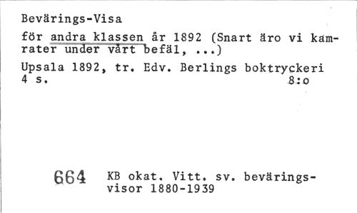 //// Bevärings-Visa //// för andra klassen år 1892 (Snart äro vi kam-rater under vårt befäl, ...) //// Upsala 1892, tr. Edv. Berlings boktryckeri 4 s. 8: o //// 664 KB °kat. Vitt. sv. bevärings- //// visor 1880-1939 ////