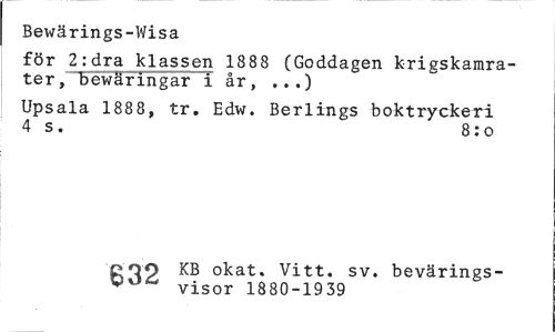 //// Bewärings-Wisa //// för 2:dra klassen 1888 (Goddagen krigskamrater, bewäringar i år, ...) //// Upsala 1888, tr. Edw. Berlings boktryckeri 4 s . 8: o //// COO KB okat. Vitt. sv. bevärings- //// Cv)6 visor 1880-1939 ////