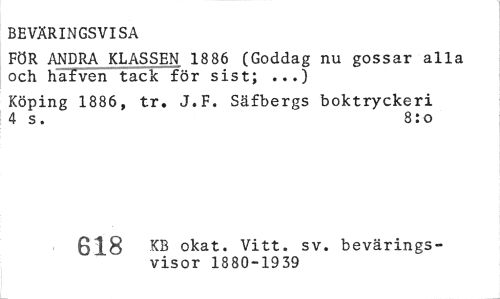 //// BEVÄRINGSVISA //// FÖR ANDRA KLASSEN 18 86 (Goddag nu gossar alla och hafven tack för sist; ...) //// Köping 1886, tr. J.F. Säfbergs boktryckeri 4 s. 8:o //// ' r*>Of» ^B okat. Vitt. sv. bevärings- //// f6D visor 1880-1939 ////