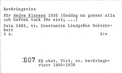 //// Beväringsvisa //// för Andra klassen 1885 (Goddag nu gossar alla och hafven tack för sist; ...) //// Sala 1885, tr. Constantin Lindgréns Boktryckeri //// 4 s. 8:o //// ' r*>Of» ^B okat. Vitt. sv. bevärings- //// f6D visor 1880-1939 ////