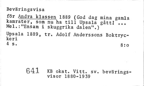 //// Beväringsvisa //// för Andra klassen 1889 (God dag mina gamla kamrater, som nu ha till Upsala gåttj ... Mel.:"Ensam i skuggrika dalen".) //// Upsala 1889, tr. Adolf Anderssons Boktryckeri //// 4 s. 8:o //// ' r*>Of» ^B okat. Vitt. sv. bevärings- //// f6D visor 1880-1939 ////