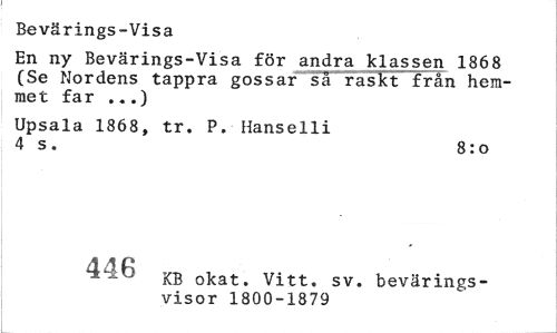 //// Bevärings-Visa //// En ny Bevärings-Visa för andra klassen 1868 (Se Nordens tappra gossar så raskt från hemmet far ...) //// Upsala 1868, tr. P. Hanselli 4 s. 8:o //// c-r\f> KB okat. Vitt. sv. bevärings- //// visor 1800-1879 ////