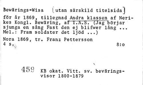 //// Bewärings*Wisa | utan särskild titelsida] //// för år 1869, tillegnad Andra klassen af Neri-kes Kongl. Bewäring, af i.A.S. (Jäg "börjar sjunga en sång Fast den ej blifwer lång ... Mel.: Fram soldater det ljöd ...) //// Nora 1869, tr. Franz Pettersson 4 s. 8: o //// v //// c-r\f> KB okat. Vitt. sv. bevärings- //// visor 1800-1879 ////