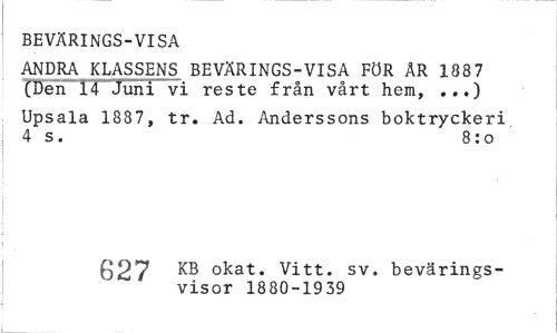 //// BEVÄRINGS-VISA //// ANDRA KLASSENS BEVÄRINGS-VISA FÖR ÄR 1887 (Den 14 Juni vi reste från vårt hem, ...) //// Upsala 1887, tr. Ad. Anderssons boktryckeri 4 s. 8:o //// ' r*>Of» ^B okat. Vitt. sv. bevärings- //// f6D visor 1880-1939 ////