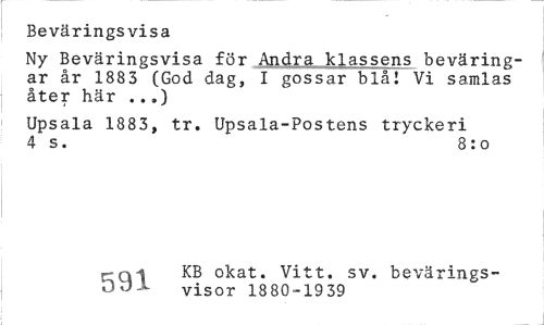 //// Beväringsvisa //// Ny Beväringsvisa för Andra klassens beväring-ar år 1883 (God dag, I gossar blål Vi samlas åter här ...) //// Upsala 1883, tr. Upsala-Postens tryckeri 4 s. 8:o //// ' r*>Of» ^B okat. Vitt. sv. bevärings- //// f6D visor 1880-1939 ////