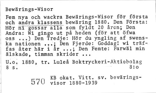 //// Bewärings-Wisor //// Fem nya och wackra Bewärings-Wisor för första och andra klassens bewäring 1880. Den Första: Hör ni gossar alla som fyldt 20 åren; Den Andra: Wi gingo ut på heden (för att öfwa oss ...) Den Tredje: Hör du yngling af swens-ka nationen ...; Den Fjerde: GoddagI wi träffas åter här i år ...; Den Femte: Farwäl min älskade, timman skrider ... //// U.o. 1880, tr. Luleå Boktryckeri-Aktiebolag 8 s. 8:o //// r-r*if} KB okat. Vitt. sv. bevärings- //// O /U visor 1880-1939 ////