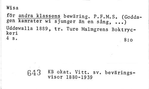 //// Wisa //// för andra klassens bewäring. P.F.M.S. (Goddagen kamrater wi sjunger än en sång, ...) //// Uddewalla 1889, tr. Ture Malmgrens Boktryckeri //// 4 s. 8:0 //// CAQ KB okat. Vitt. sv. bevärings- //// visor 1880-1939 //// i ////