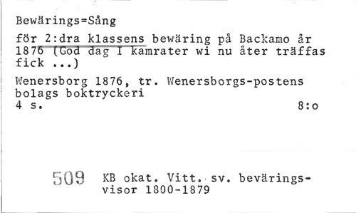 //// Bewärings=Sång //// för 2:dra klassens bewäring på Backamo år 1875™ (.(dod dag i kamrater wi nu åter träffas fick ...) //// Wenersborg 1876, tr. Wenersborgs-postens bolags boktryckeri //// 4 s. 8:o //// cr-tn KB okat. Vitt. sv. bevärings- //// visor 1800-1879 ////