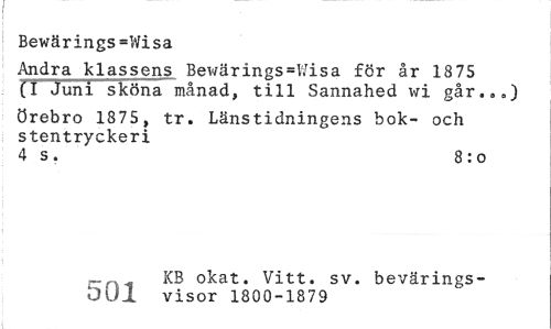 //// Bewärings=Wisa //// Andra klassens Bewärings=V.risa för år 18 75 (I Juni sköna månad, till Sannahed wi går.,.) //// Örebro 1875, tr. Länstidningens bok- och stentryckeri //// 4 s. 8 : o //// _„ KB okat. Vitt. sv. bevärings- //// bUl visor 1800-1879 ////