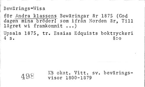 //// Bewärings=!Visa //// för Andra klassens Bewäringar är 18 75 (God dagen mina bröder! som ifrån Norden är, Till lägret wi framkommit ...) //// Upsala 1875, tr. Esaias Edquists boktryckeri 4 s. 8:o //// _„ KB okat. Vitt. sv. bevärings- //// bUl visor 1800-1879 ////
