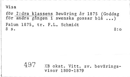 //// Wisa //// för 2: dra klassens Bewäring år 18 75 (Goddag för andra gången i swenska gossar blå ...) //// Falun 1875, tr. F.L. Schmidt 8 s. 8:o //// 497 KB okat. Vitt. sv. bevärins?s- //// visor 1800-1879 ////