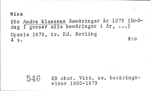 //// Wisa //// för Andra klassens Bewäringar år 1878 (Goddag I gossar alla bewäringar i år, //// Upsala 1878, tr. Ed. Berling //// 4*s. 8:0 //// 546 KB okat. Vitt. sv. bevärings- //// visor 1800-1879 ////