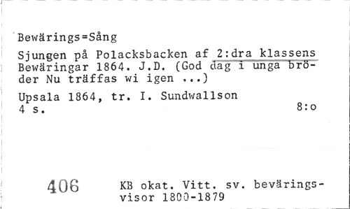 //// Bewärings=Sång //// Sjungen på Polacksbacken af 2:dra klassens Bewäringar 1864. J.D. (God dag i unga örö-der Nu träffas wi igen ...) //// Upsala 1864, tr. I. Sundwallson 4 s. 8:o //// 408 KB okat. Vitt. sv. bevärings- //// visor 1800-1879 ////