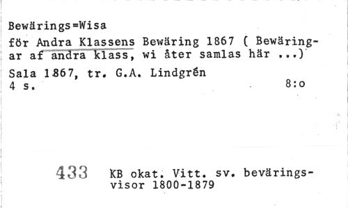 //// Bewärings=Wisa //// för Andra Klassens Bewäring 1867 ( Bewäringar af andra klass, wi åter samlas här ,,.) //// Sala 1867, tr. G.A. Lindgrén 4 s. 8:o //// _„ KB okat. Vitt. sv. bevärings- //// bUl visor 1800-1879 ////