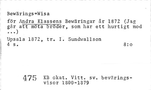 //// Bewärings=Wisa //// för Andra Klassens Bewäringar år 1872 (Jag går att möta bröder, som har ett hurtigt mod //// Upsala 1872, tr. I. Sundwallson 4 s. 8:o //// _„ KB okat. Vitt. sv. bevärings- //// bUl visor 1800-1879 ////