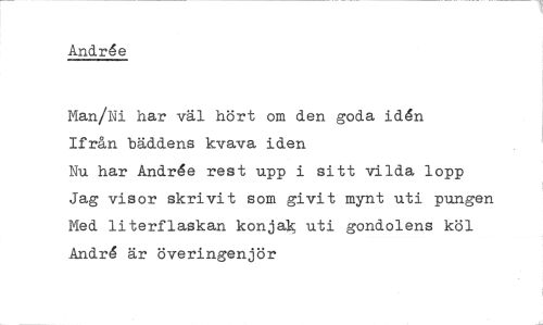 //// Andrée //// Man/Ni har väl hört om den goda idén Ifrån bäddens kvava iden Nu har Andrée rest upp i sitt vilda lopp Jag visor skrivit som givit mynt uti pungen Med literflaskan konjak uti gondolens köl André är överingenjör ////