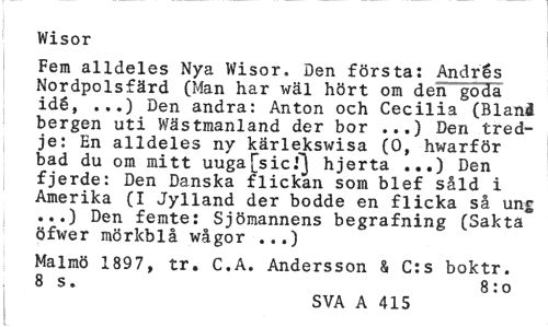 //// Wisor //// Fem alldeles Nya Wisor, Den första: Andrés Nordpolsfärd (Man har wäl hört om den goda idé, ...) Den andra: Anton och Cecilia (Bland bergen uti Wästmanland der bor ...) Den tredje: En alldeles ny kärlekswisa (0, hwarför bad du om mitt uuga[sici] hjerta ...) Den fjerde: Den Danska flickan som blef såld i Amerika (I Jylland der bodde en flicka så ung ...) Den femte: Sjömannens begrafning (Sakta öfwer mörkblå wågor ...) //// Malmö 1897, tr. C.A. Andersson & C:s boktr. //// 8 s. 8 :o //// SVA A 415 ////