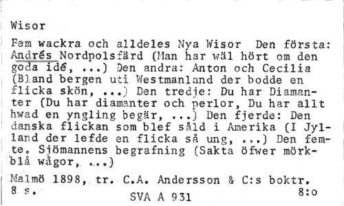 //// Wisor //// Fem wackra och alldeles Nya Wisor Den första: Andrés Nordpols färd (Han har wäl hört om den goda idé, ...) Den andra: Anton och Cecilia (Bland bergen uti Westmanland der bodde en flicka skön, ...) Den tredje: Du har Diamanter (Du har diamanter och perlor, Du har allt hwad en yngling begär, ..? ) Den fjerde: Den danska flickan som blef såld i Amerika (I Jylland der lefde en flicka så ung, .».) Den femte» Sjömannens begrafning (Sakta öfwer mörkblå wågor, ...) //// Malmö 1898, tr. C.A. Andersson S> C:s boktr. //// 8 SVA A 931 8:0 ////
