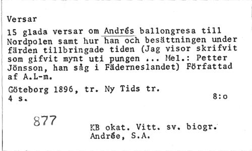 //// Versar //// 15 glada versar om Andrés ballongresa till Nordpolen samt hur han och besättningen under färden tillbringade tiden (Jag visor skrifvit som gifvit mynt uti pungen ... Mel.: Petter Jönsson, han såg i Fäderneslandet) Författad af A.L-m. //// Göteborg 1896, tr. Ny Tids tr. 4 s. 8:o //// H7 7 //// " ? KB okat. Vitt. sv. biogr. //// Andrée, S.A. ////
