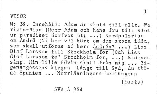 //// 1 //// VISOR //// N: 39. Innehåll: Adam är skuld till allt. Wa-riete-Wisa (Herr Adam och hans fru till slut ur paradiset derfvos ut; ...) Nordpolsvisa om Andre (Ni har väl hört om den stora idén, som skall utföras af herr Andrén? ...) Liss Olof Larsson till Stockholm for (Och Liss Olof Larsson te* Stockholm for, ...) Sjömanssång. Min lille Edvin skall från mig ... Zi-genargossens klagan Långt till Syd, du sköna Spanien ... Norrlänningens hemlängtan //// (forts) //// SVA A 954 ////