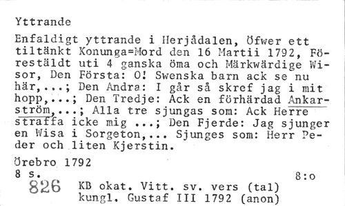 //// Yttrande //// Enfaldigt yttrande i Herjådalen, öfwer ett tiltänkt Konunga=Mord den 16 Martii 1792, Föres täldt uti 4 ganska öma och Märkwärdige Wi-sor, Den Första: 01 Swenska barn ack se nu här,...; Den Andra: I går så skref jag i mit hopp,...; Den Tredje: Ack en förhärdad Ankarström,...; Alla tre sjungas som: Ack Herre straffa icke mig ...; Den Fjerde: Jag sjunger en Wisa i Sorgeton,... Sjunges som: Herr Peder och liten Kjerstin. //// Örebro 1792 //// 8 s. 8:o //// g2G KB okat. Vitt. sv. vers (tal) //// kunsi, Gustaf III 1792 Canon) ////