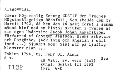 //// Klago=Wisa, //// öfwer Högstsalig Konung GUSTAF den Tredjes Högstbeklageliga Dödsfall, Som skedde den 29 Martii 1792, då han den 16 näst förut i samma månad blef med en Pistol skjuten i ryggen af sin egen Undersåte Jacob Johan Ankarström. Författad af Georgen Jansson. Bruks arbetare och östgöthe. (Ack sorg och ängslan i wårt land ...) Sjunges som: Sist när på ljuflig blomster plan ... //// Fahlun 1794, tr. Pehr 01. Axmar //// 8 s* KB Vitt. sv. vers (tal) 8:0 //// ^ kungl. Gustaf III 1792 //// 1138 förf G-K ////