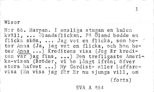 //// 400 //// Wisor //// N:r 66, Harpan. I ensliga stugan en kulen kväll, ... ol ands flickan. På Öland bodde en flicka skön, Jag vet en flicka, som he- ' ter Anna (Ja, jag vet en flicka, och hon heter Anaa ...) Kreditens visa (Jag är krediten var jag fins, ,,.) Den trefligaste Amerika-visan (Bröder, vi bo långt ifrån; öfver stora hafvet ...) Ny Gardist- eller Luffarevisa (En visa jag för Er nu sjunga vill, om //// (forts) //// SVA A 24 3 ////
