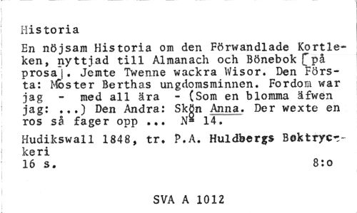 //// Historia //// En nöjsam Historia om den Förwandlade Kortleken, nyttjad till Almanach och Bönebok fpå prosa|. Jemte Twenne wackra Wisor. Den Första: Moster Berthas ungdomsminnen. Fordom war jag - med all ära - (Som en blomma äfwen jag: ...) Den Andra: Skön Anna. Der wexte en ros så fager opp ... 14. //// Hudikswall 1848, tr. P.A. Huldbergs Boktryct-keri //// 16 s. 8:o //// SVA A 1012 ////