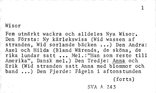//// 1 //// Wisor //// Fem utmärkt wackra och alldeles Nya Wisor. Den Första: Ny kärlekswisa (Wid wassen a£ stranden, Wid sorlande bäcken ...) Den Andra: Axel och Hilda (Bland Wärends, de sköna, de rika lundar satt ... Mel.:"Han som reste till Amerika", Dansk mel.) Den Tredje: Anna och Erik (Wid stranden satt Anna med blommor och band Den Fjerde: Fågeln i aftonstunden //// (forts) //// SVA A 24 3 ////