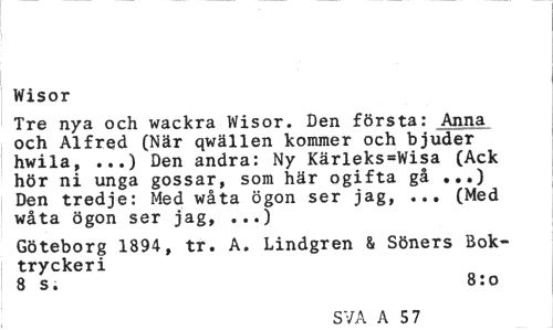 //// Wisor //// Tre nya och wackra Wisor. Den första: Anna och Alfred (När qwällen kommer och bjuder hwila, ...) Den andra: Ny Kärleks=Wisa (Ack hör ni unga gossar, som här ogifta gå ...) Den tredje: Med wåta ögon ser jag, ... (Med wåta ögon ser jag, ...) //// Göteborg 1894, tr. A. Lindgren & Söners Boktryckeri //// 8 s. 8:0 //// SVA A 57 ////