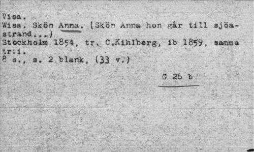 //// Visa. //// Wisa. Skön Anna. (Skön Anna hon går till sjoa-strand...) //// Stockholm 1&54, tr. C.Kihlbsrg, ib 1859, samma tr: i. //// 8 3., s. 2 blank, (33 v.) //// a 26 b ////