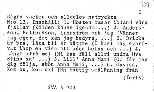 //// m //// i //// Några vackra och alldeles nytryckta N:o 13. Innehåll: 1. Hösten rasar ibland våra fjällar (Kölden känns igenom ...) 2* Andersson, Pettersson, Lundström och jag (Vänner jag eger, det kan jag bedyra, .,.) 3. Bricka är bra, låta bli är bättre (I hast jag svarf-vut ihop en visa Att både helan och ...) 4. Långt ifrå mej (Ni kan fäll allri undra Hva Stina sa' ...) 5. Lill' Anna Mari (Oi får jag dig följa, skön Anna Mari, ...) 6. Oxvisa. Kom ox, kom ox.1 (En fattig smålänning från //// (forts) //// SVA A 929 ////