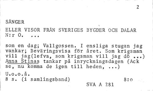 //// 2 //// SÅNGER //// \ //// ELLER VISOR FRÅN SVERIGES BYGDER OCH DALAR N:r 0. ... //// som en dag; Vallgossen. I ensliga stugan jag vankar; Beväringsvisa för året. Som krigsman vill jag(lefva, som krigsman vill jag dö ..») Anna Stinas tankar på inryckningsdagen (Ack se, nu komma de igen till heden, ...) //// U.o.o.å, //// 8 s. (i samlingsband) 8:o //// SVA A 281 ////