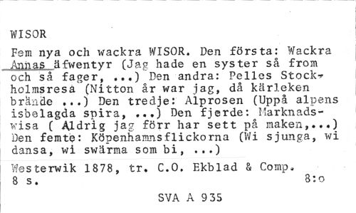 //// WISOR //// Fem nya och wackra WISOR. Den första: Wackra Annas äfwentvr (Jag hade en syster så from och så fager, ...) Den andra: Pelles Stock* holmsresa (Nitton år war jag, då kärleken brände ,..) Den tredje: Alprosen (Uppå alpens isbelagda spira, ...) Den fjerde: Marknads-visa ( Aldrig jag förr har sett på maken,...) Den femte: Köpenhamns flickorna (Wi sjunga, wi dansa, wi sv/ärma som bi, ...) //// Westerwik 1878 , tr. C.O. Ekblad & Comp. 8 s. 8:0 //// SVA A 9 35 ////