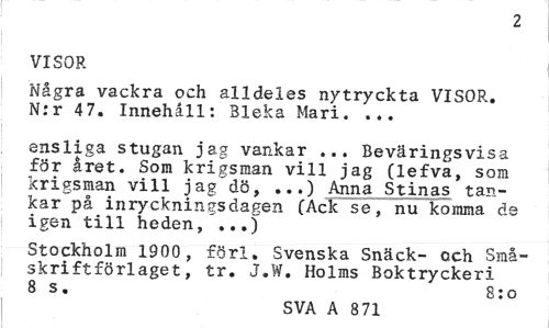 //// 2 //// VISOR //// Några vackra och alldeles nytryckta VISOR. N:r 4 7. Innehåll: Bleka Mari. ... //// ensliga stugan jag vankar ... Beväringsvisa för året. Som krigsman vill jag (lefva, som krigsman vill jag'dö, ...) Anna Stinas tankar på inryckningsdagen (Ack se, nu komma de igen till heden, ...) //// Stockholm 1900, förl. Svenska Snäck- och Småskriftförlaget, tr. J.W. Holms Boktryckeri 8 s. 8:o //// SVA A 8 71 ////