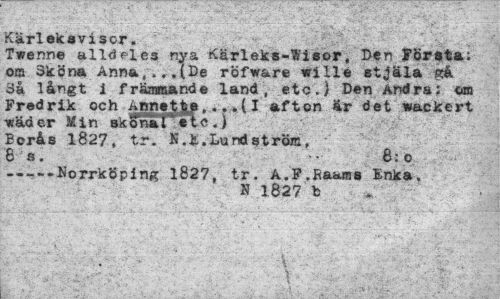 //// Kärleksvisor. //// Twenne alldeles nya tCärleks-Wisor, Den Första: //// om Sköna Anna,...(De röfware wille stjäla gå //// Så långt i främmande land, etc.) Den Andra; om //// Fredrik och Annetfre,...(1 afton 4r det wackert //// wäder Min skonafetc.) //// Eerås 1827, tr. N. t. Lund ström „ //// 8 a. •• 8: o //// ---KoTrköpinfc 1827, tr. A.F.Raams fcnka. //// » 1827 b //// * ... - ////