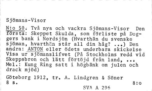 //// Sjömans-Visor //// N:o 50. Två nya och vackra Sjömans-Visor Den första: Skeppet Skulda, som förliste på Dog-gers bank i Nordsjön (Hvarthän du svenske sjöman, hvarthän står all din håg? ...) Den andra: ANTON eller ödets underbara skickelse Visa ur sjömanslifvet (På Stockholms redd vid Skeppsbron och lätt förtöjd från land, ... Mel.: Kung Ring satt i högbänk om julen och drack mjöd) //// Göteborg 1912, tr. A. Lindgren & Söner 8 s. 8:o //// SVA A 296 ////