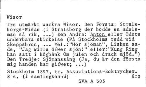 //// Wisor //// Tre utmärkt wackra Wisor. Den Första: Strals-borgs=Wisan (I Stralsborg der bodde en adelsman så rik, .,.) Den Andra: Anton eller ödets underbara skickelse (På Stockholms redd wid Skeppsbron, ... Mel.:"Hör sjöman", Lisken sade, "Jag wille öfwer sjöni" eller:"Kung Ring han satt i högbänk Om julen och drack mjöd.") Den Tredje: Sjömanssång (Ja, du är den första mig handen har gifwet; ...) //// Stockholm 1897, tr. Associations=Boktrycker* //// 8 s. (i samlingsband) 8:0 //// SVA A 603 ////