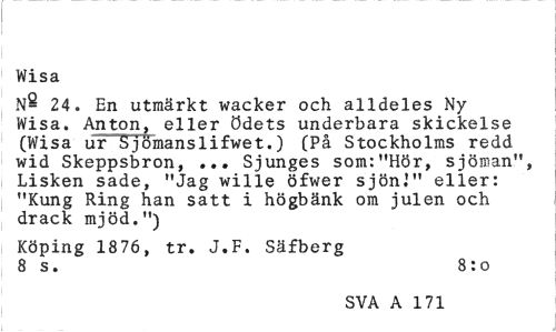 //// Wisa //// 24. En utmärkt wacker och alldeles Ny Wisa. Anton, eller ödets underbara skickelse (Wisa ur Sjömanslifwet.) (På Stockholms redd wid Skeppsbron, ... Sjunges som:"Hör, sjöman", Lisken sade, "Jag wille öfwer sjön."' eller: "Kung Ring han satt i högbänk om julen och drack mjöd.") //// Köping 1876, tr. J.F. Säfberg //// 8 s. 8: o //// SVA A 171 ////
