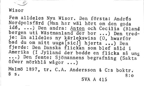 //// Wisor //// Fem alldeles Nya Wisor. Den första: Andrés Nordpolsfärd (Man har wäl hört om den goda idé, ...) Den andra: Anton och Cecilia (Blanå bergen uti Wästmanland der bor ...) Den tredje: En alldeles ny kärlekswisa (0, hwarför bad du om mitt uuga[sicJ"} hjerta Den //// fjerde: Den Danska flickan som blef såld i Amerika (I Jylland der bodde en flicka så ung ...) Den femte: Sjömannens begrafning (Sakta öfwer mörkblå wågor ...) //// Malmö 1897, tr, C.A. Andersson & C:s boktr. //// 8 s. 8 :o //// SVA A 415 ////
