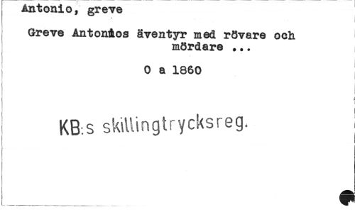 //// Antonio, greve //// Greve Antonåos äventyr med rövare och //// mördare ... //// 0 a 1860 KB.S s k\ Il i n g t r y c k s r e g. //// I___• ////