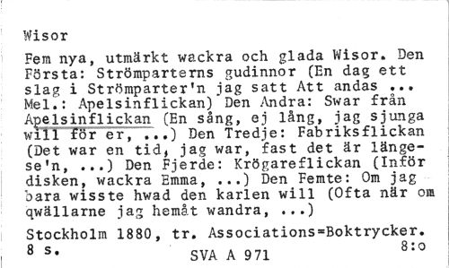 //// Wisor //// Fem nya, utmärkt wackra och glada Wisor. Den Första: Strömparterns gudinnor (En dag ett slag i Strömparter'n jag satt Att andas ... Mel.: Apelsinflickan) Den Andra: Swar från AgeIsinflickan (En sång, ej lång, jag sjunga will för er, ...) Den Tredje: Fabriksflickan (Det war en tid, jag war, fast det är längesen, ...) Den Fjerde: Krögareflickan (Inför disken, wackra Emma, ...) Den Femte: Om jag bara wisste hwad den karlen will (Ofta när om qwällarne jag hemåt wandra, ...) //// Stockholm 1880, tr. Associations=Boktrycker. //// 8 S* SVA A 971 8:0 ////